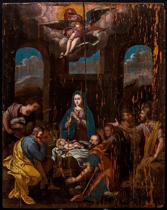Olie på træ som skildrer hyrdernes tilbedelse. En engel peger på Jesusbarnet fra himlen.